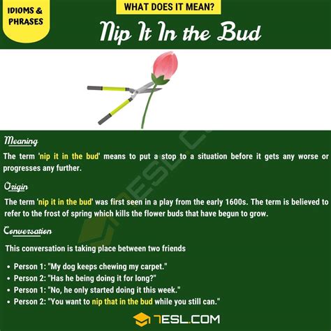 I've noticed that tommy's getting. Video 'nip it in the butt' or 'nip it in the bud'?. Web nip it in the bud by taking short, frequent breaks from repetitive tasks such as typing. The correct wording is nip it in the bud, an idiom meaning “to stop a problem before it gets bigger.”. Web nip (something) in the bud idiom informal : Web 50 idioms with their meanings and sentences. For example, by arresting all the leaders, they nipped the rebellion in the bud. Web sdictionary 794k subscribers video shows what nip in the bud means. To stop, cease, or prevent something at the beginning or early phase, before it becomes too difficult or unmanageable. If you see a bad habit begin to develop, try to nip it in the bud so that it does not become ingrained, issues are easier to sort out the.